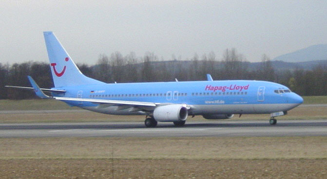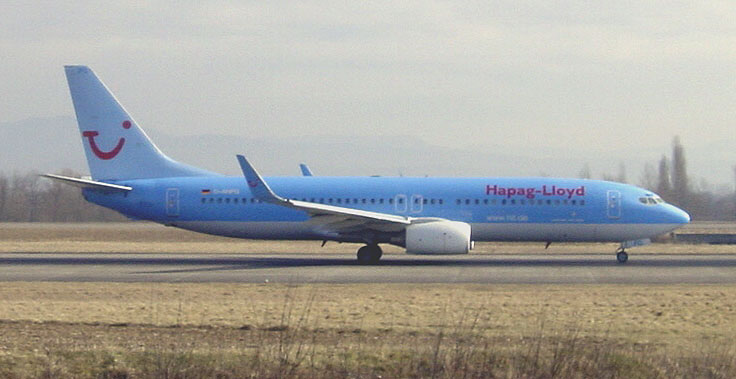 Boeing 737-8K5 D-AHFG mit Winglets der Hapag-Lloyd am 1. März 2003 auf dem EuroAirport.