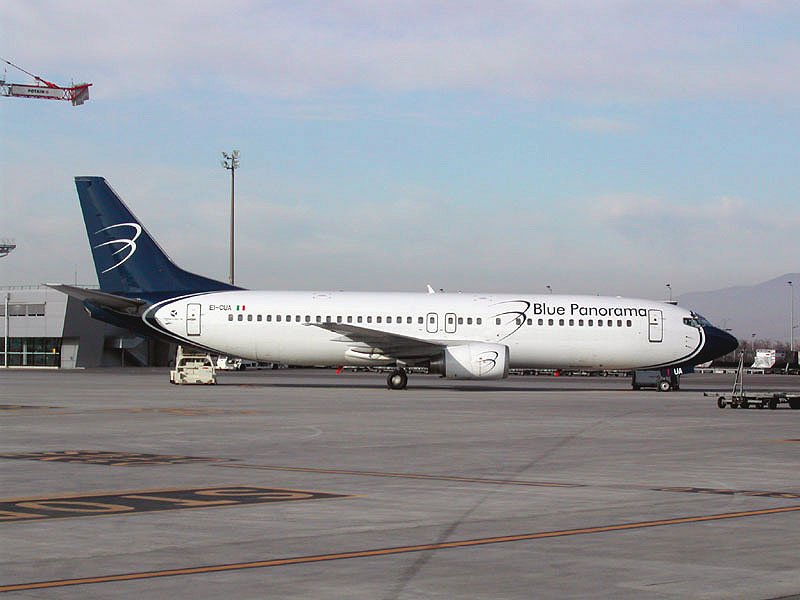 Die in Irland registrierte Boeing 737-4K5 (EI-CUA) der italienischen Blue Panorama Airlines brachte am 17. März 2003 die Mannschaft von Juventus Torino nach Basel.