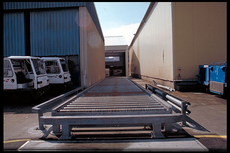 Die Frachtbehälter (Unit Load Device ULD) werden auf Rollwegen transportiert