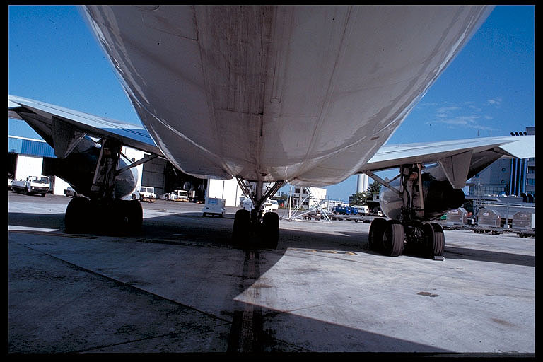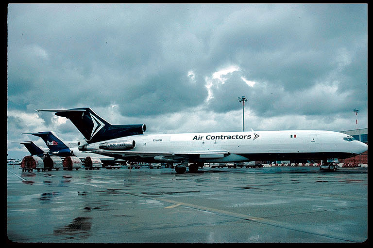 Das imposante Hauptfahrwerk einer DC-10F Eine Boeing 727 von Air Contractrors Zwei Boeing 747-200F und eine DC10-30F in Reih und Glied