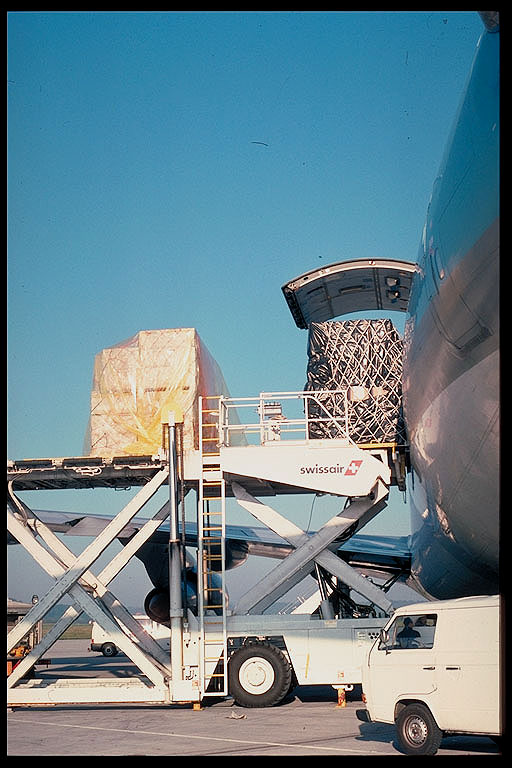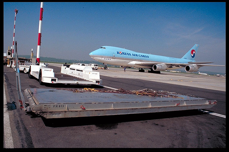 Die B747 von Korean Air Cargo wird durch die hintere Seitentüre beladen Die B747-200F von Korean Air Cargo fliegt zwei Mal wöchentlich Seoul-EAP Zwei Frachtjumbos von Korean und Evergreen