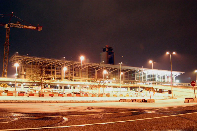 Der EuroAirport von der Landseite, 13. Januar 2003. Das neue Terminalgebäude Nord am 1. Dezember 2002.
